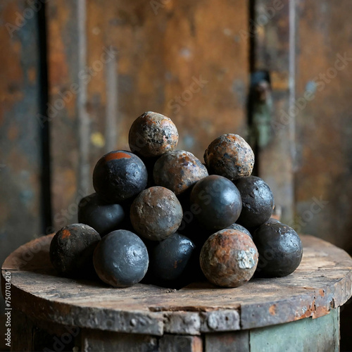 Fototapeta premium Alte Kanonenkugeln auf einem Fass