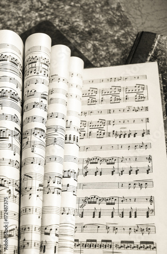 © bidaya, Fototapeta premium Alte Notenblätter, Vintage, Musik für Trauerfeier
