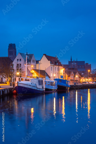 Fototapeta premium Alter Hafen mit Fischerbooten in der Hansestadt Wismar zur Blauen Stunde