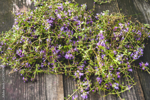© Liudmyla V, Fototapeta premium Alternative Medicine.Thyme and medical ampoules. Essential oils