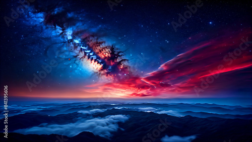 Obraz premium Alternative night sky: stars, Milky Way, galaxy, space, astronomy, clouds and nebulae, shades of red and blue, bright colors against the background of dark space