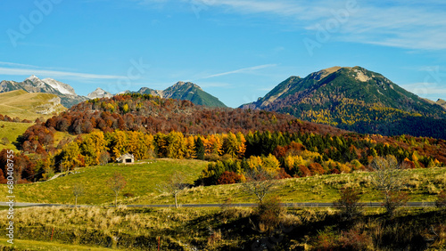 © anghifoto, Fototapeta premium Altopiano di Lessinia. Panorama autunnale sui pascoli e le malghe. Provincia di Verona.Veneto, Italia