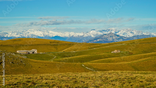 Fototapeta premium Altopiano di Lessinia. Panorama autunnale sui pascoli e le malghe. Provincia di Verona.Veneto, Italia