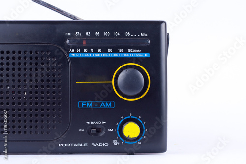 © ninefar, Obraz premium AM, FM portable radio transistor receiver of black vintage retro style on white background isolated close up