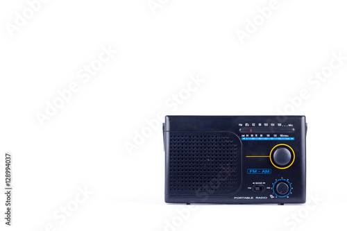 © ninefar, Fototapeta premium AM, FM portable radio transistor receiver of old black vintage retro style on white background isolated