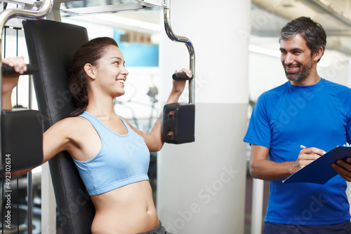 © Stigur/peopleimages.com, Fototapeta premium Am I doing this correctly. Cropped shot of an attractive young woman using an exercise machine while her personal trainer looks on.