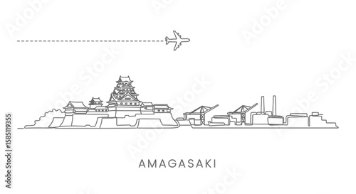 Fototapeta premium Amagasaki Line Art Castle with Plane, and Cityscape.