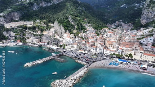© bydronevideos, Fototapeta premium Amalfi Coast In Positano Salerno Italy. Aerial View Of A High-Rise Buildings And Traffic Showcasing Urban Life. Shore Horizon Beach Sea. Shore Seaside Tropical Environment. Positano Salerno.