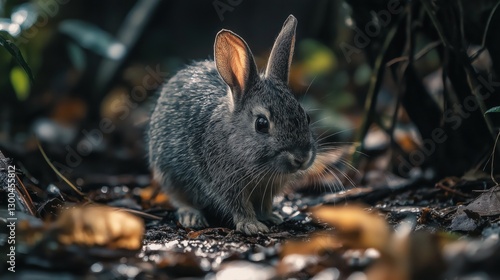 Fototapeta premium Amami rabbit cautiously exploring forest floor in natural habitat at dusk