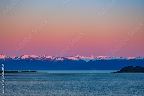 © JuanPablo, Obraz premium Amanecer sobre montañas nevadas detrás de un lago