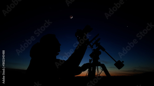 © astrosystem, Fototapeta premium Amateur astro-photographer with a camera on a tripod photographing night sky with stars, planets, Moon and other celestial objects.