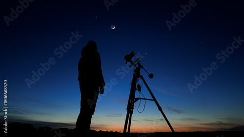 Fototapeta premium Amateur astro-photographer with a camera on a tripod photographing night sky with stars, planets, Moon and other celestial objects.