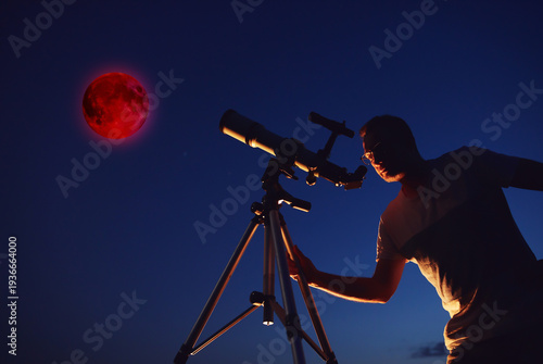 © astrosystem, Fototapeta premium Amateur astronomer observing Lunar eclipse with a astronomical telescope.