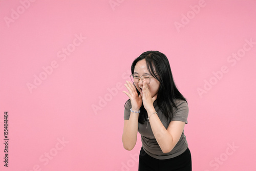 Fototapeta premium amazed, announcement, asian, astonished, attention, body language, calling, calling out, casual, cheering, chindo, communication, concept, cute, east asian, emotion, excited, excitement, expression, f