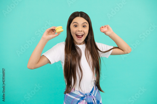 Fototapeta premium amazed child hold french macaron or macaroon cookies, sweet tooth