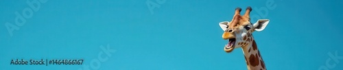 © Theerawat, Naklejka premium Amazed giraffe portrait, open mouth, blue background, blue, whimsical, long neck