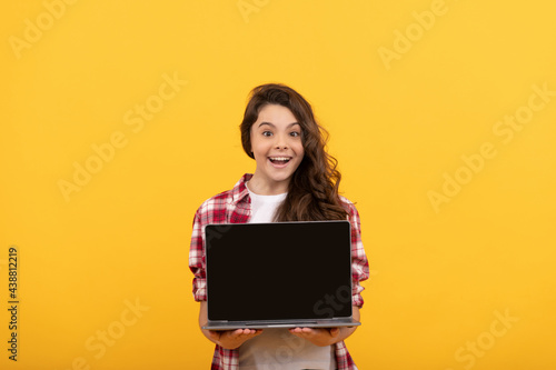 © Olena, Naklejka premium amazed smart child presenting laptop at school online lesson, school presentation