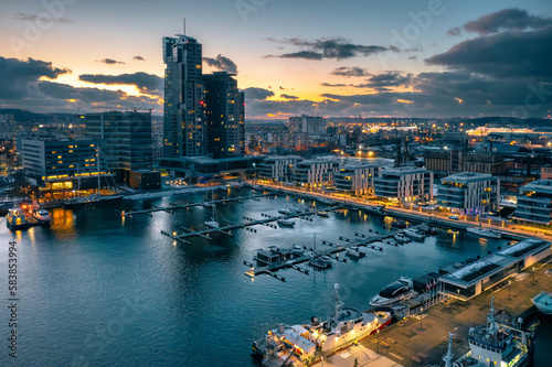 Obraz premium Amazing aerial cityscape of Gdynia by the Baltic Sea at dusk. Poland