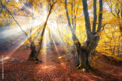 Fototapeta premium Amazing autumn forest in fog with bright sun rays at sunset. Beautiful trees with orange leaves and red foliage. Colorful landscape with enchanted foggy forest and golden sunlight. Fairy wood. Nature
