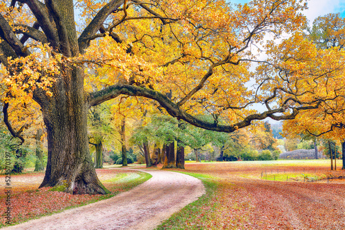 Naklejka premium Amazing autumn landscape with old oak trees in Muskau Park.