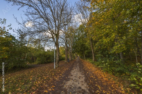 © Alex, Naklejka premium Amazing beauty on road in autumn forest on blue sky with white clouds. Beautiful autumn nature backgrounds.