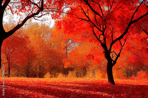 Fototapeta premium Amazing bright red autumn landscape, idyllic and peaceful wild nature scenery. Beautiful season fall background. Digital art.