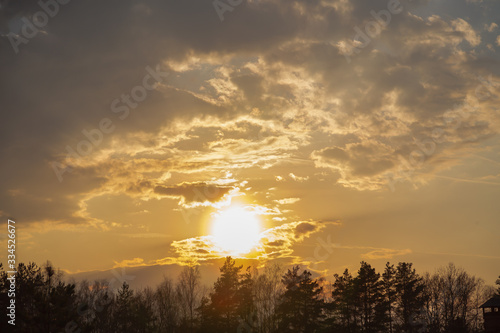 © Viktor, Obraz premium Amazing cloudy pattern with sunset over small town