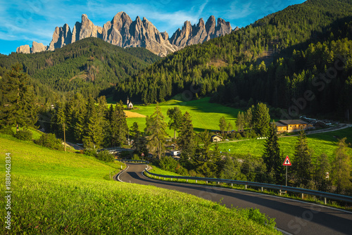 Fototapeta premium Amazing Funes valley with green fields and spectacular cliffs, Dolomites