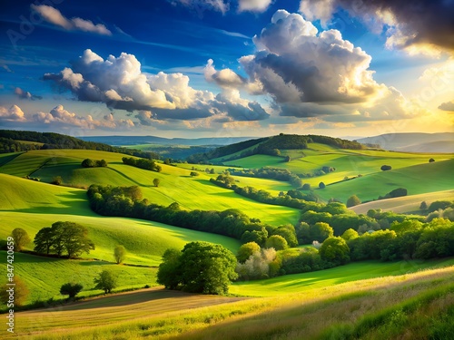 Obraz premium Amazing Green Hills Landscape Under A Cloudy Blue Sky