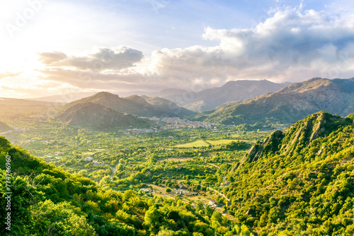 Naklejka premium amazing highland view from above to a canyon and valley between mountains and green hills, cloudy sunset landscape of beautiful highland