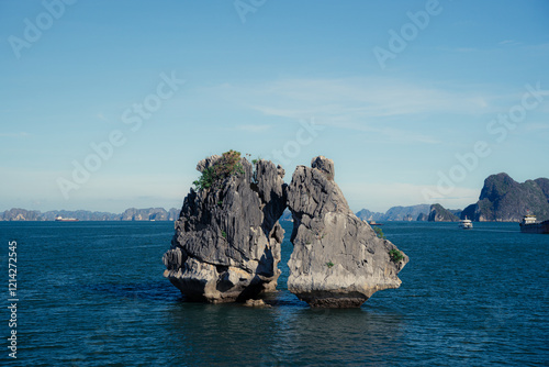 © Krisna, Fototapeta premium Amazing kissing chicken rock. One of the best iconic rock in Ha Long Bay, Vietnam. Perfect for background or travel wallpaper