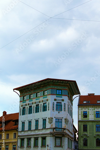 © evgenij84, Fototapeta premium Amazing landscape view of ancient building in the heart of the city against blue sky at sunny autumn day. Architect and landmark concept Presernov square, Ljubljana, Slovenia