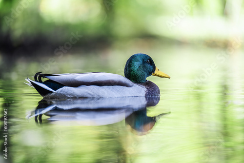 © The Len, Fototapeta premium Amazing mallard duck swims in lake or river with green water