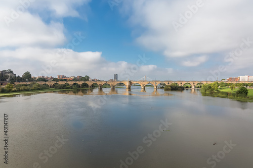 Naklejka premium Amazing morning view at the Guadiana river and Palmas bridge, Guadiana Park river on banks, Badajoz downtown city, Spain