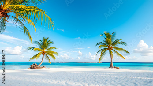 Fototapeta premium Amazing nature beach palm trees moody sky. Summer vacation travel holiday background. Maldives paradise beach. Luxury travel summer holiday tourism. Sunny coast fantastic pristine sea water. Ai gen