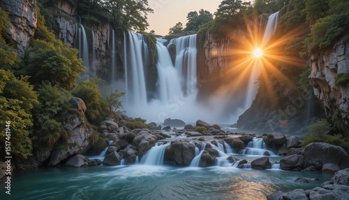 © Fakharking, Obraz premium Amazing nature landscape, beautiful waterfall at sunrise, famous Skradinski buk, one of the most beautiful waterfalls in Europe and the biggest in Croatia, outdoor travel background
