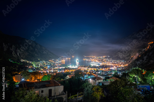 Fototapeta premium Amazing night view of the picturesque Bay of Kotor with the illuminated streets, buildings and cruise ships at the harbor.