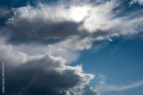 Fototapeta premium Amazing panoramic view against the backdrop of white clouds and blue sky. Beautiful clouds with sunbeams shining through.
