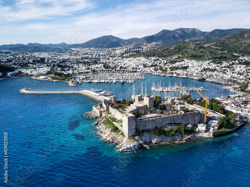 © Aleksey, Naklejka premium Amazing panoramic view from drone of Bodrum harbour and ancient Kalesi castle