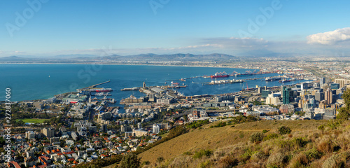 © Roger de la Harpe, Fototapeta premium Amazing panoramic view of beautiful Cape Town from the slopes of Signal Hill showing V&A waterfront, harbour and business centre. Western Cape. South Africa