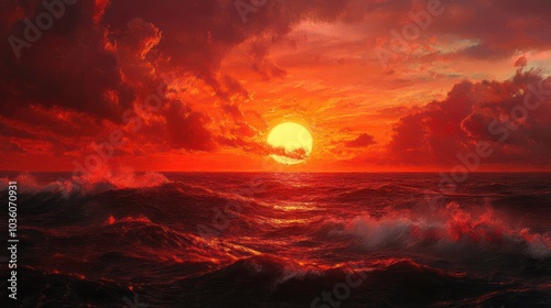 © Johannes, Obraz premium Amazing red sunset over ocean.