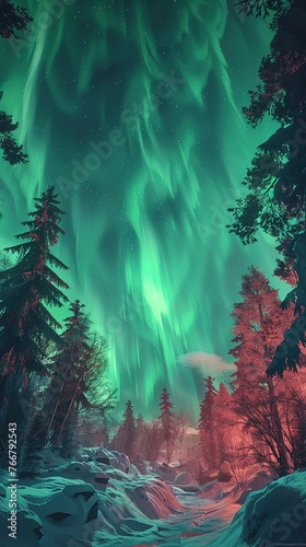 Obraz premium Amazing scenery of green aurora borealis shining in night sky over snowy...