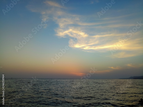 © Wingedbull, Naklejka premium Amazing sea sunset on the pebble beach, the sun, waves, clouds