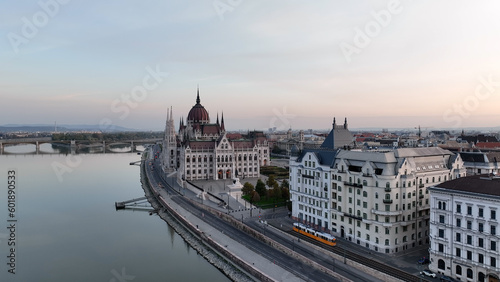 Naklejka premium Amazing Skyline Establishing Bird Eye Aerial View Shot of Budapest city. Hungarian Parliament Building with the Danube river at sunrise. Hungary