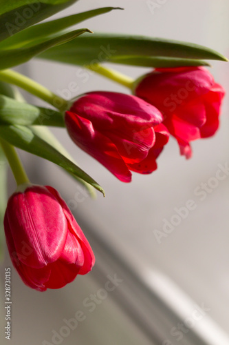 Fototapeta premium Amazing spring flowers. Beautiful red tulips in vase