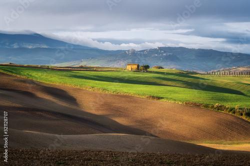 Fototapeta premium Amazing spring landscape with green rolling hills and farm houses in the heart of Tuscany in morning