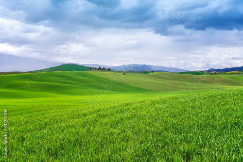 Fototapeta premium Amazing spring landscape with green rolling hills and farm houses in the heart of Tuscany in morning