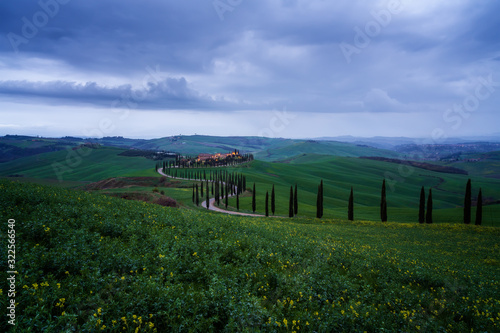 Naklejka premium Amazing spring landscape with green rolling hills, cypresses and farm house in the heart of Tuscany after sunset