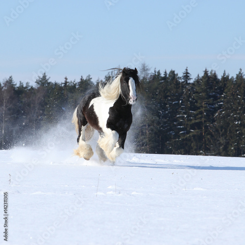 © Zuzana Tillerova, Fototapeta premium Amazing stallion of irish cob running in winter