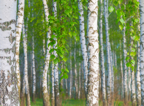 Obraz premium Amazing sunny morning in a birch grove. Beautiful spring landscape.